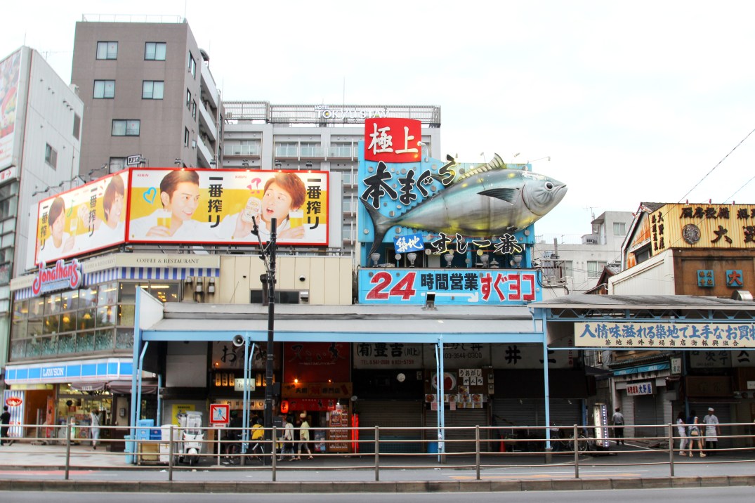 Apparently I’ve become an extremely lazy blogger full of false promises. Getting used to the new job has been a tad stressful, as has been living in an actual apartment (rather than a dorm) by myself. Also, it’s really, really hot. Excuses aside, here’s an extra-long post to make up for it. These are shots of my “neighborhood,” or at least the area within a 20-minute walk radius. IMG_2539-1 This doesn’t look like much, but it’s actually the rearview of the very famous Tsukiji Fish Market (築地市場). If you know anything about Japan, you’d know that they’re very serious about their fish, so this place is pretty much holy ground. All the guide books recommend going to Tsukiji at 5 a.m. to watch the fish auctions and eat the freshest sushi imaginable, but I actually get pretty squeamish around large quantities of dead animals so I’ve yet to do that. On that happy note, let’s continue. IMG_2611-1 IMG_2542-1 ^ The commercial streets of the market have a ton of great food stalls, though most are closed for dinner. Another hallmark of Tsukiji is the Tsukiji Hongan-ji (築地本願寺), a Buddhist temple notable for its massive presence smack in the middle of apartment and office buildings as well as its decidedly un-Japanese appearance. IMG_2552-1 The original temple, built in 1617, was actually located in Asakusa (where the famous Senso-ji of this earlier insta can be found) and burned down in a fire in the 1600s. The temple was then relocated to its current location in Tsukiji, where it stood until the Great Kanto Earthquake of 1923. The current temple, with strong influences from Southeast Asian Buddhist architecture, was designed in the 1930s. IMG_2554-1 IMG_2613-1 IMG_2559-1 Moving closer to my apartment, we meet the Sumida River (隅田川), a cultural symbol of Tokyo and also the site of popular annual fireworks, which I went to see last week (iPhone pictures from that event were really underwhelming though). IMG_2562-1 IMG_2569-1 This is my favorite part of my walk home from work, also the place where I jog (by which I mean like, once a week, lol). Just look at it! IMG_2584-1 Here’s shot from the fire escape of my apartment, which happens to be right next to a popular fishing spot: IMG_2588-1 Now for the place where I actually live: Tsukishima (月島, lit. “Moon Island”), a half-urbanized, half-traditional place with skyscrapers as well as some lovely architecture left from the Edo period. IMG_2596-1
